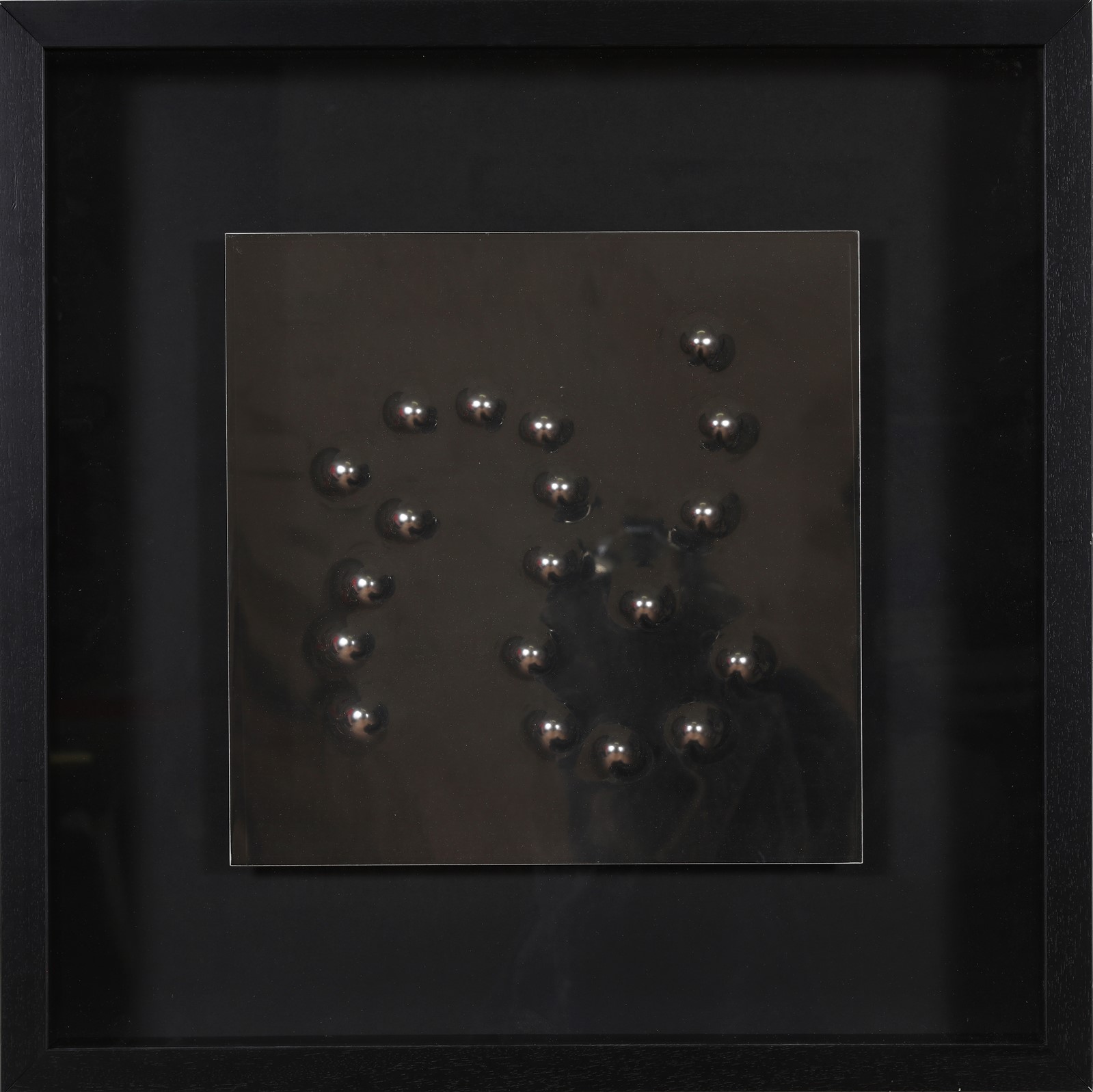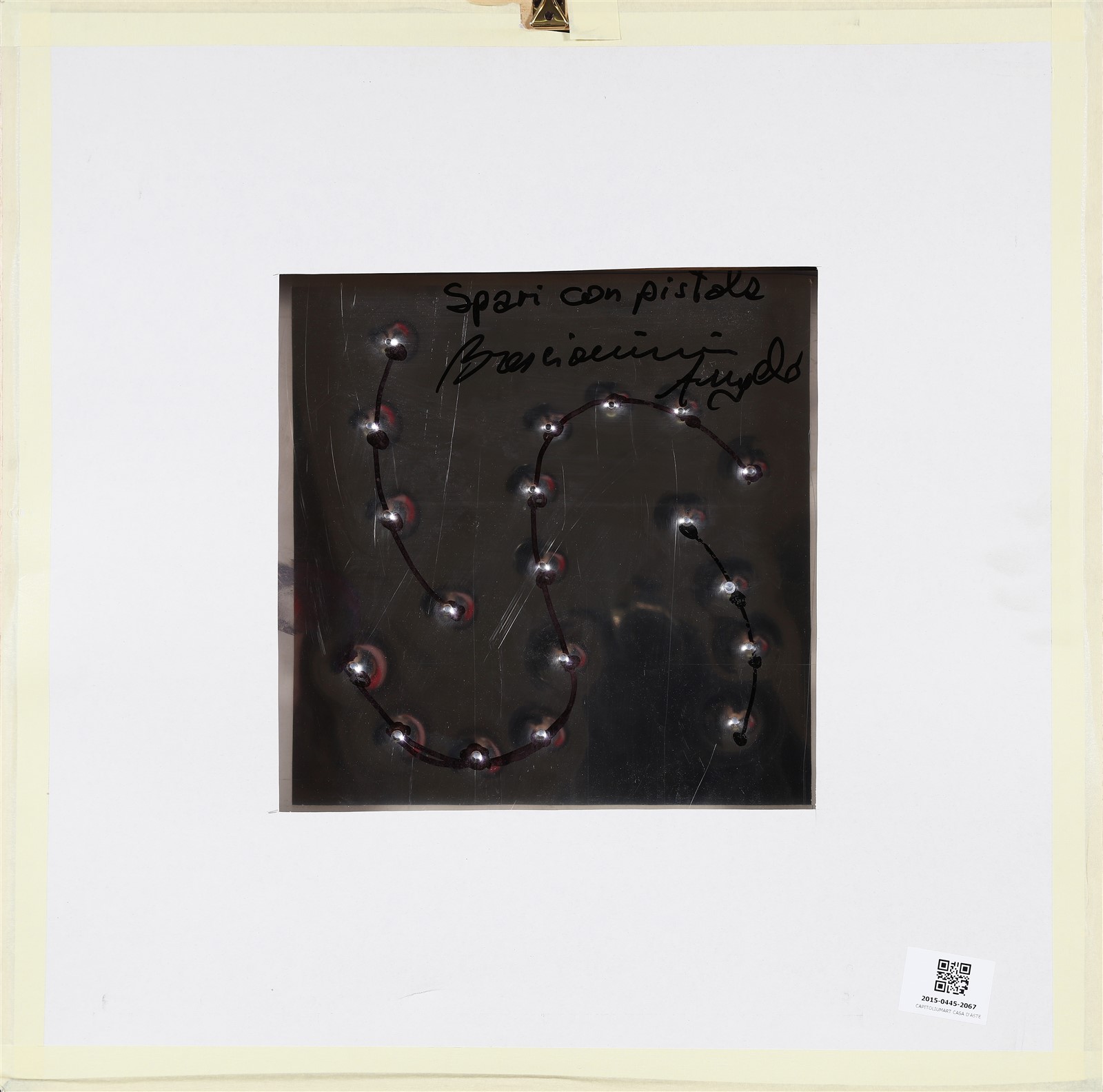 BRESCIANINI ANGELO (n. 1948) Spari con pistola. Spari su lamiera. Cm 40,00 x 40,00. Al retro titolo e firma. Autentica dell'artista su fotografia. Cornice presente