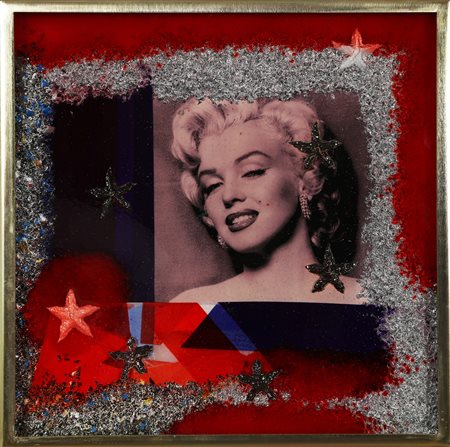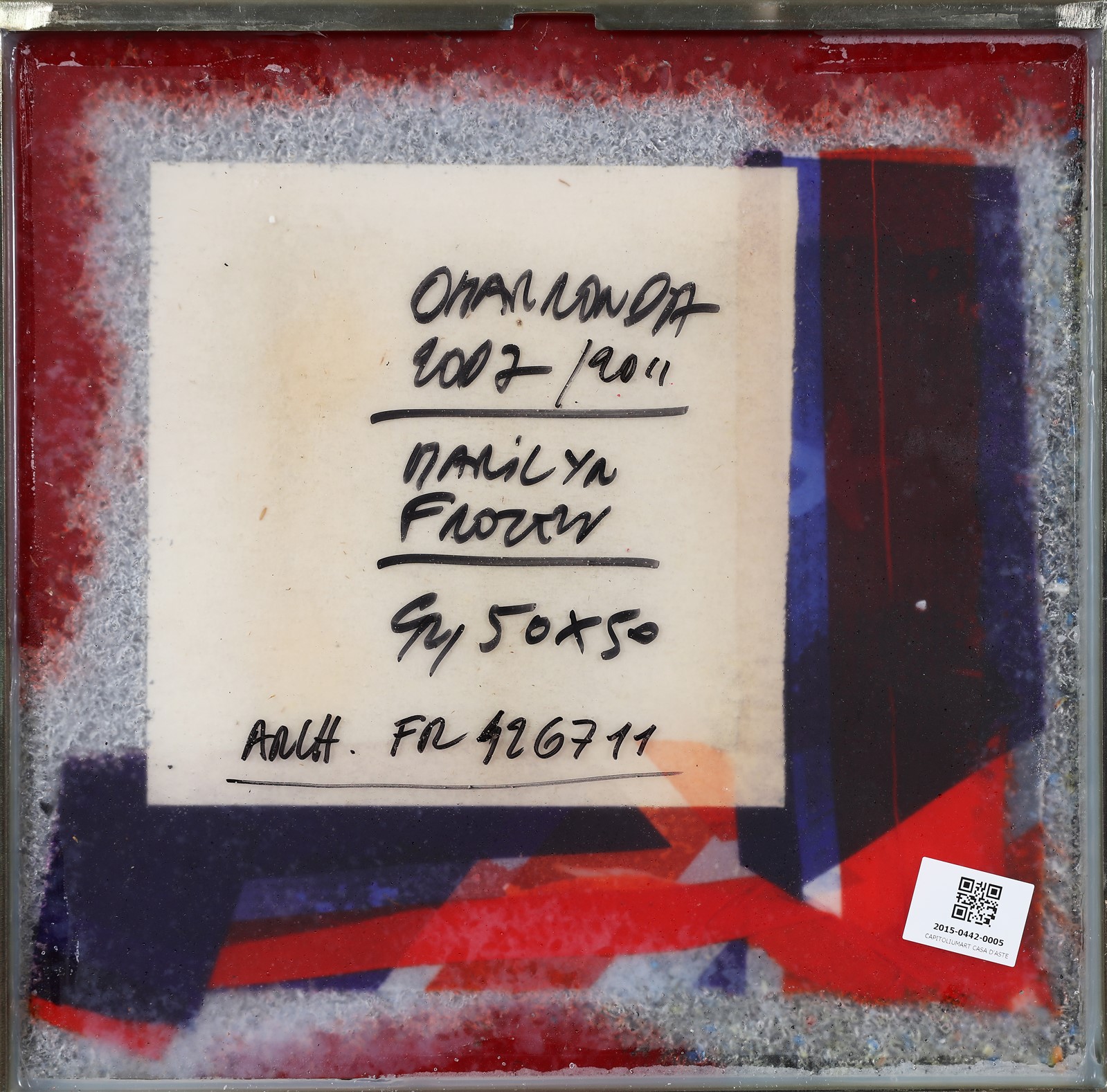 RONDA OMAR (n. 1947) Marilyn Frozen. 2011. Tecnica mista su lamina. Cm 50,00 x 50,00. Al retro titolo, firma e anno. Autentica dell'artista su fotografia riportante il relativo numero d'inventario.