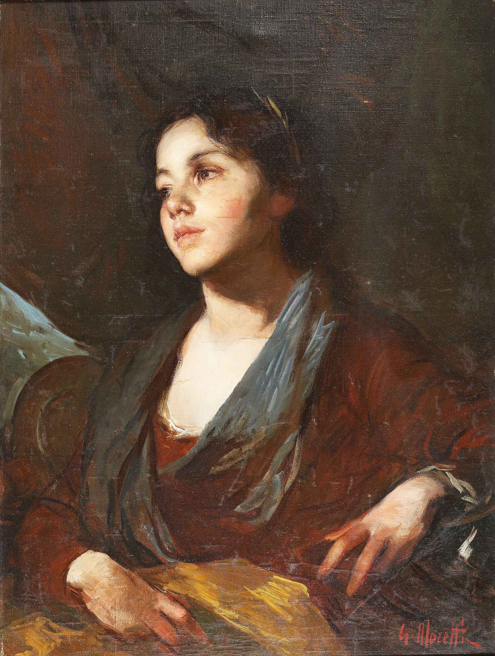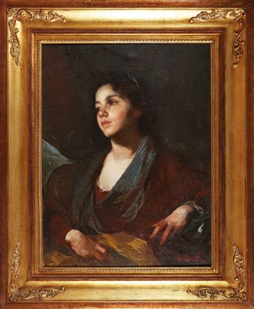 MORETTI GIACOMO (n. 1939) Ragazza. Olio su tela . Cm 60,00 x 80,00. Firmato in basso a destra. Cornice presente