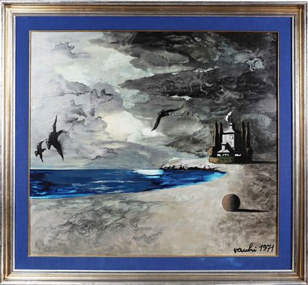 VACCHI SERGIO (n. 1925) Paesaggio della solitudine. 1971. Olio su tela. Cm 100,00 x 90,00. Firma e anno in basso a destra. Al retro titolo, firma e anno. Cornice presente