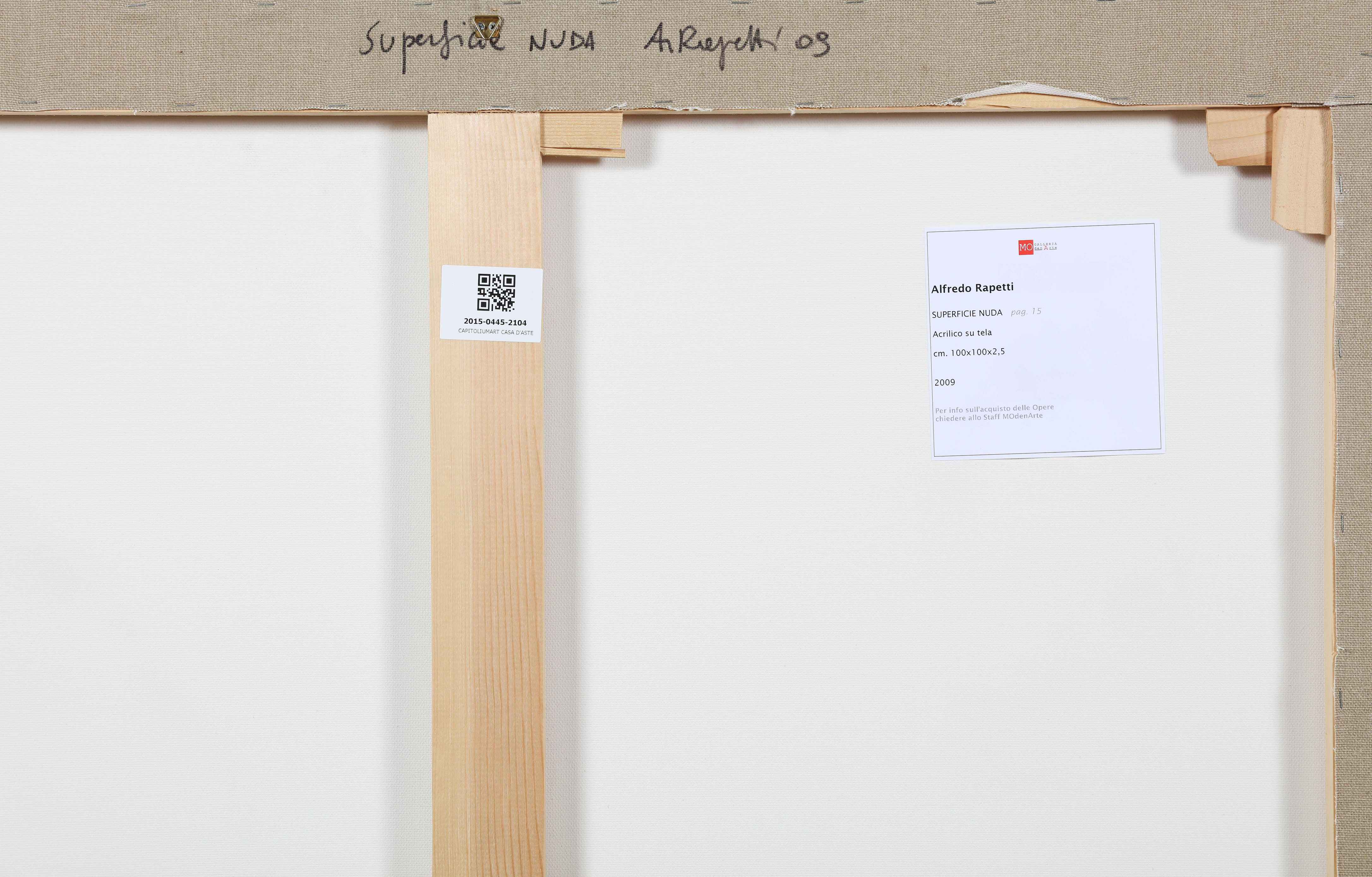 RAPETTI ALFREDO (n. 1961) Superficie nuda. Tecnica mista su tela di juta. Cm 100,00 x 100,00. Al retro titolo, firma e anno. Cartiglio descrittivo a cura di Galleria ModenArte, Iseo (Bs).