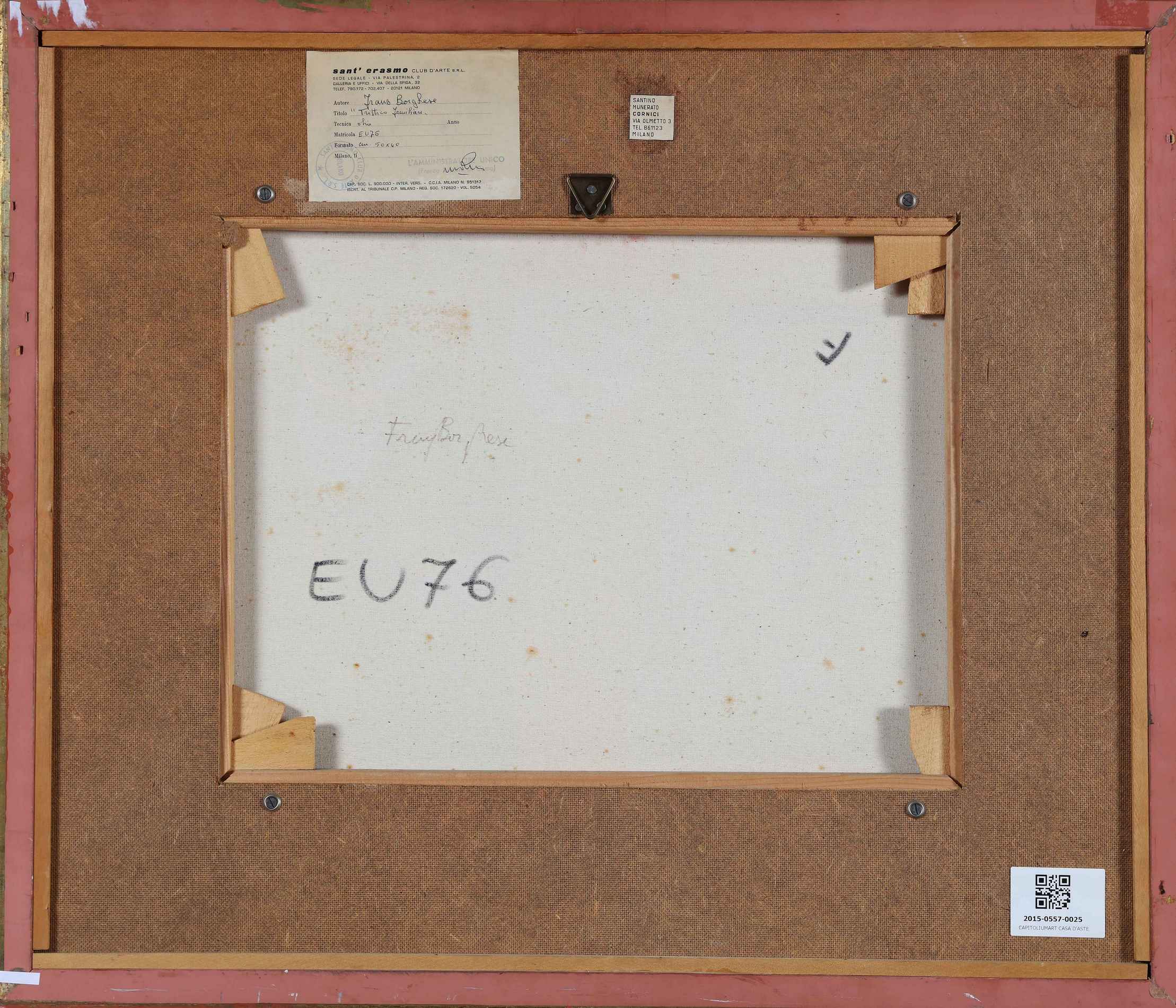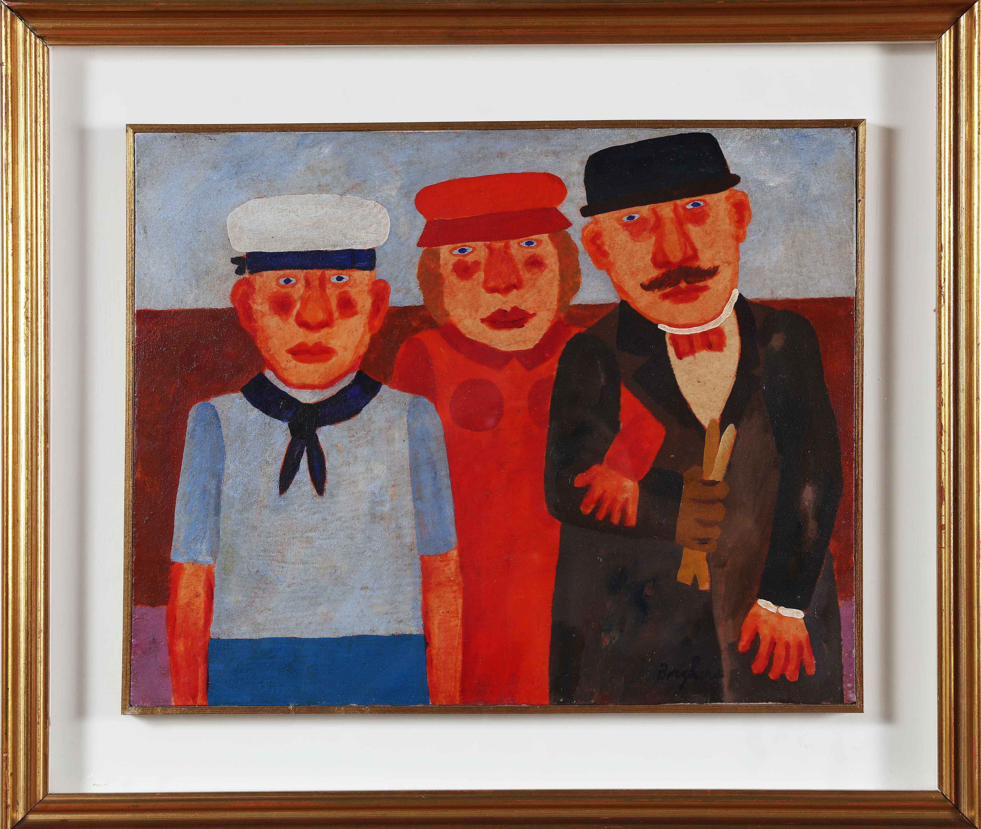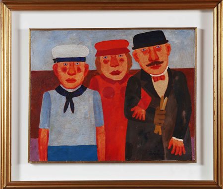 BORGHESE FRANZ (1941 - 2005) Trittico familiare. Olio su tela. Cm 50,00 x 40,00. Firma in basso a destra. Al retro firma e cartiglio descrittivo a cura della Galleria Sant'Erasmo, Milano. Cornice presente