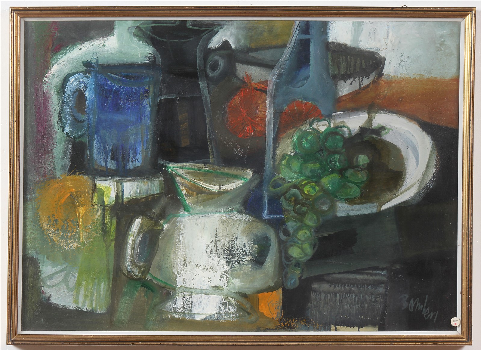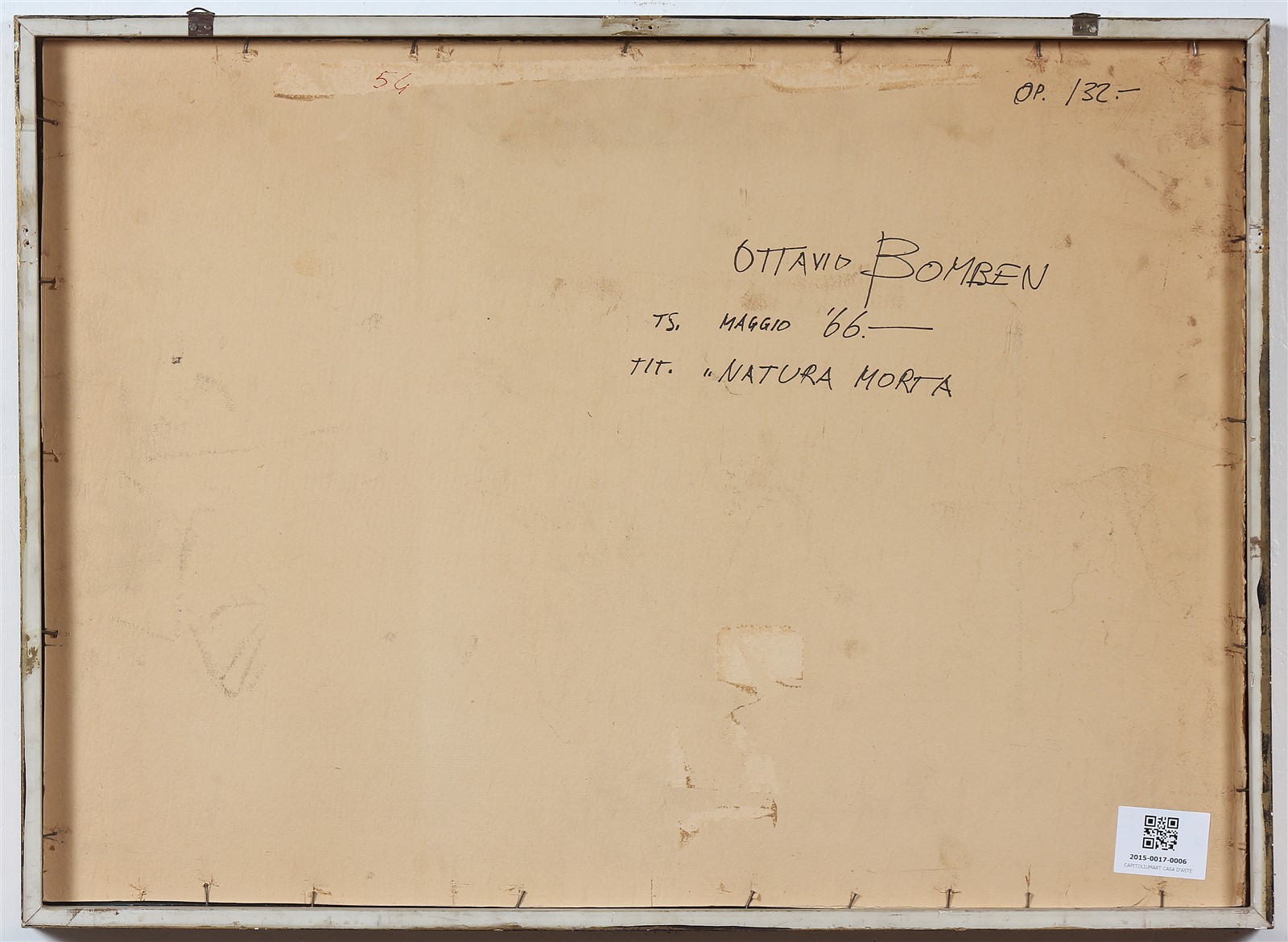 BOMBEN OTTAVIO (1925 - 2006) Natura morta. 1966. Olio su cartone. Cm 70,00 x 50,00. Firma in basso a destra. Al retro firma, titolo e anno. Cornice presente