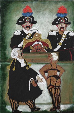 LOMBARDO SALVO (n. 1948) Processino. Olio su tavola. Cm 20,00 x 30,00. Firma in basso a destra. Autentica dell'artista su fotografia. Opera archiviata presso l'Archivio Salvo Lombardo come da numero d'archivio riportato al retro; al retro titolo e firma.