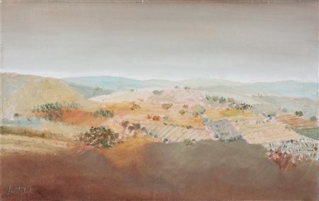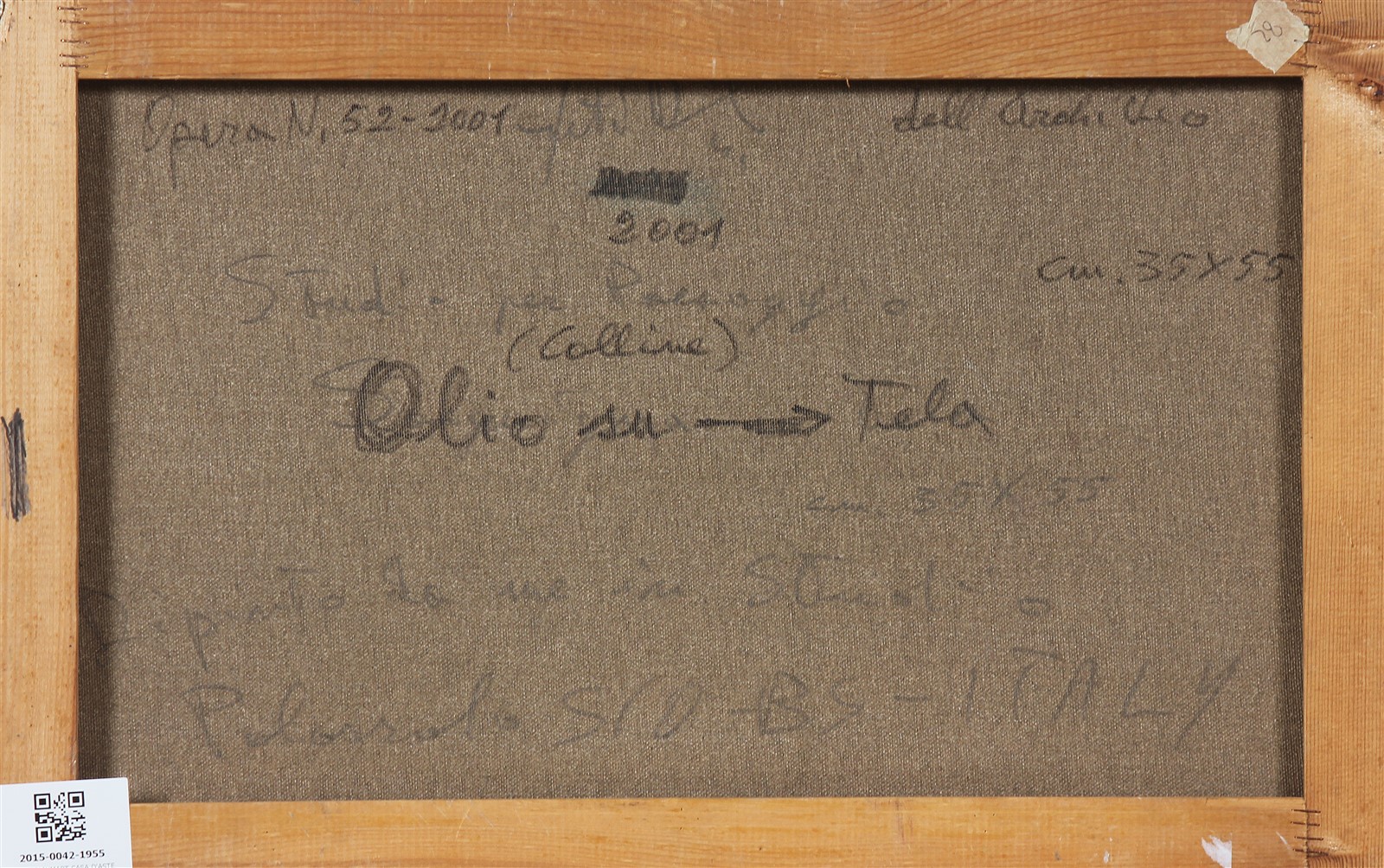 MANENTI DANILO (n. 1951) Studio di collina. Olio su tela . Cm 55,00 x 45,00. Firma in basso a sinistra.Al retro firma, titolo, luogo. Autentica dell' artista su fotografia riportante il numero di archivio.