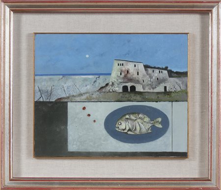 SCAPATICCI GIULIO (1933 - 2006) Composizione con fossile. 1972. Olio su tela. Cm 50,00 x 40,00. Firma al retro G.Scapaticci '72. Cornice presente