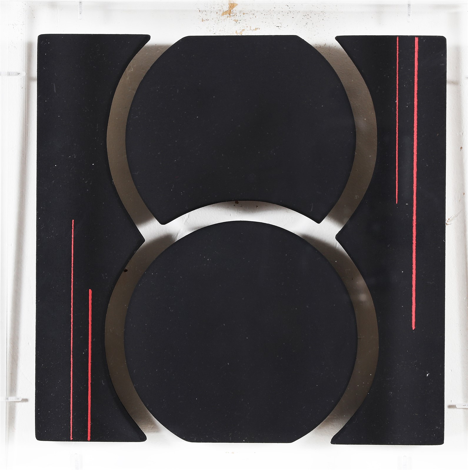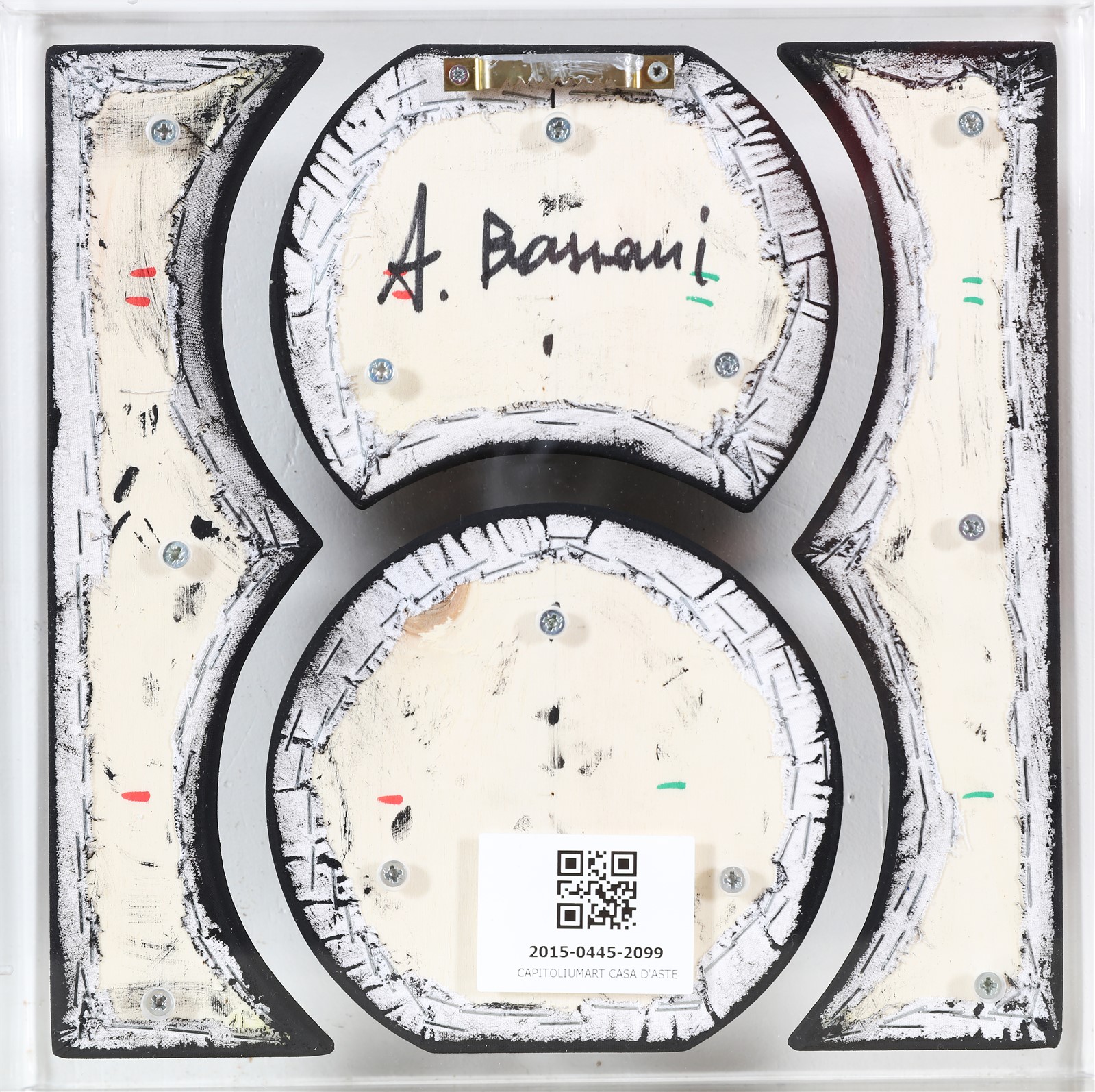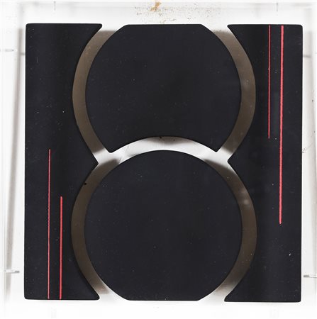 BASSANI ANDREA (n. 1954) Senza titolo. Acrilico su tela sagomata. Cm 30,00 x 30,00. Firma al retro. Opera contenuta in teca di plexiglass. Autentica dell'artista su fotografia. Cornice presente
