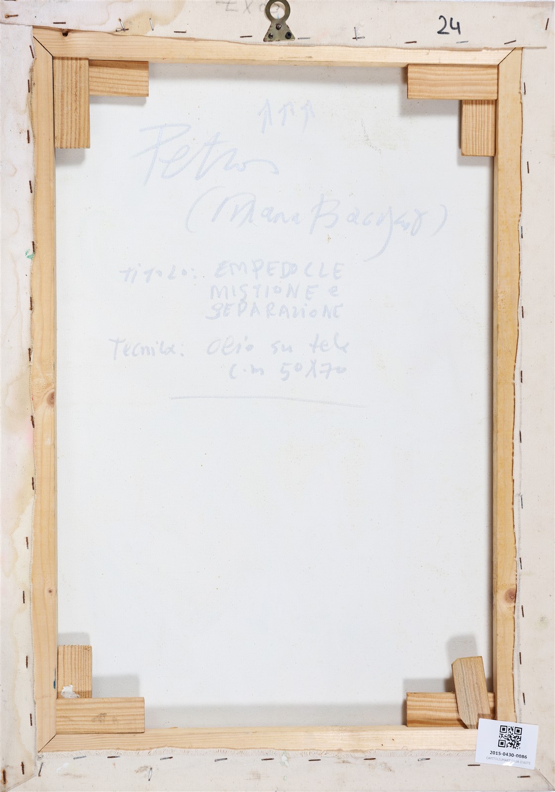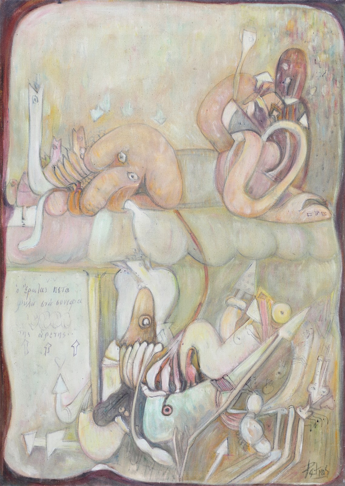 PAPAVASSILIOU PETRUS (n. 1928) Empedocle, Mistione e separazione. Olio su tela. Cm 70,00 x 50,00. Firma in basso a destra. Al retro firma e titolo.