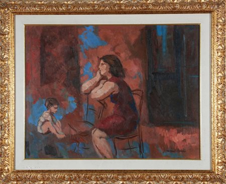 CASTELLANI MARIO (1914 - 1985) Donna e bambino. Olio su tela. Cm 65,00 x 50,00. Firma in basso a destra. Al retro firma e titolo. Cornice presente