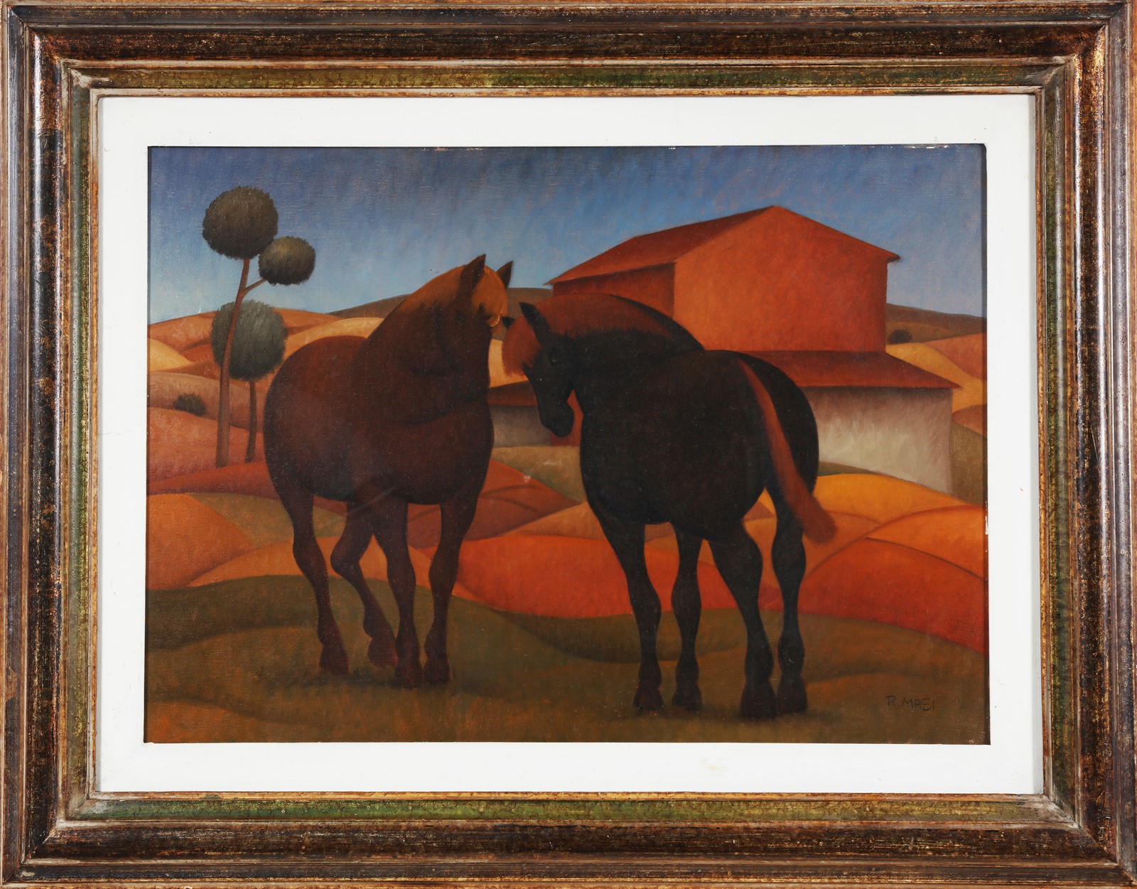 MASI PAOLO (n. 1933) Cavalli. 1984. Olio su tela. Cm 70,00 x 50,00. Firma in basso a destra e al retro. Presente documento di autentica a cura di Renzo Spagnoli Arte, Firenze. Cornice presente
