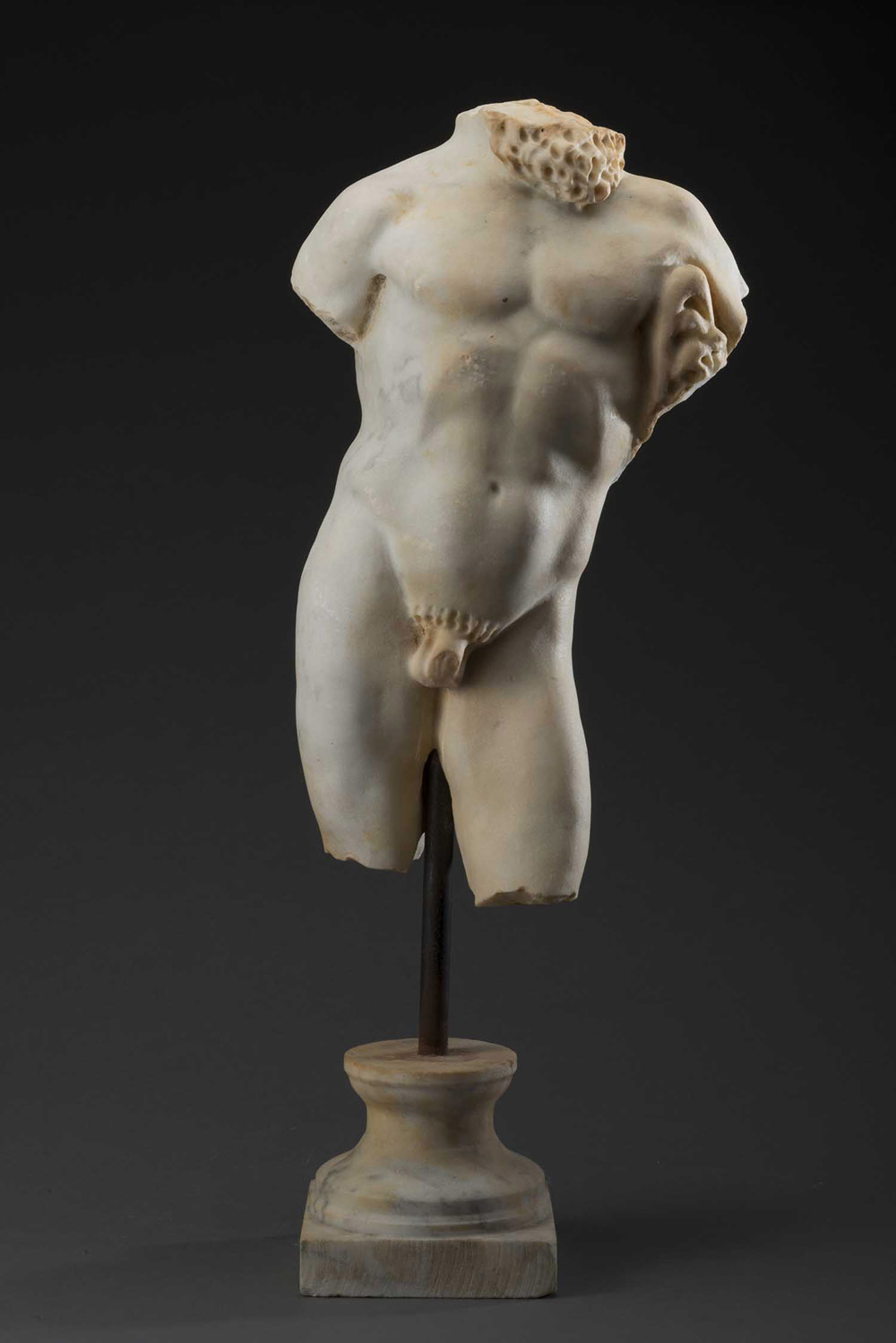 Mezzo busto virile in stile classico in marmo, poggiante su base tornita (h tot cm 57) Male marble half-bust