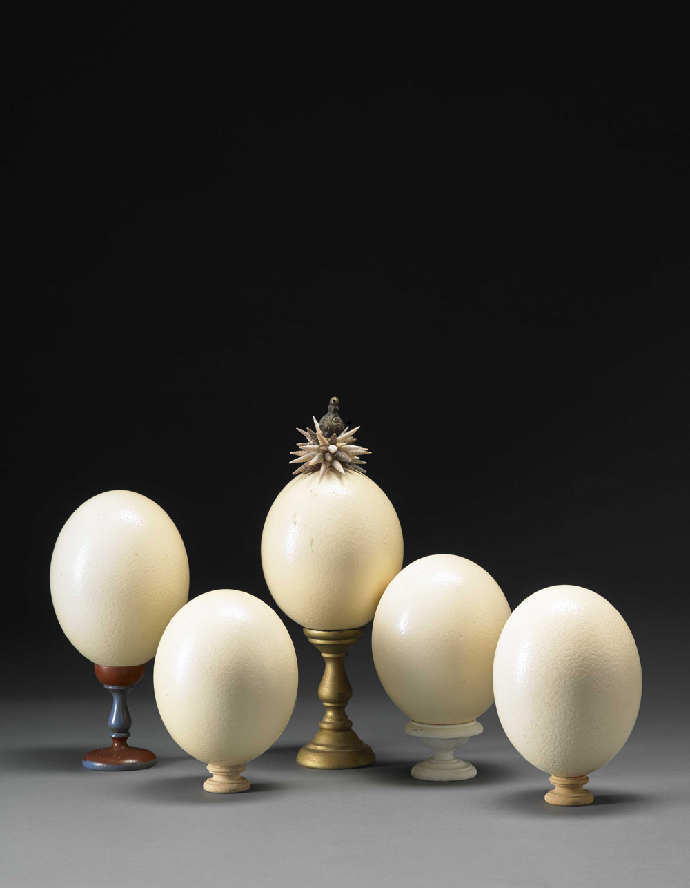 Lotto di cinque composizioni con uova di struzzo poggianti su basi diverse Lot comprising five compositions with ostrich eggs