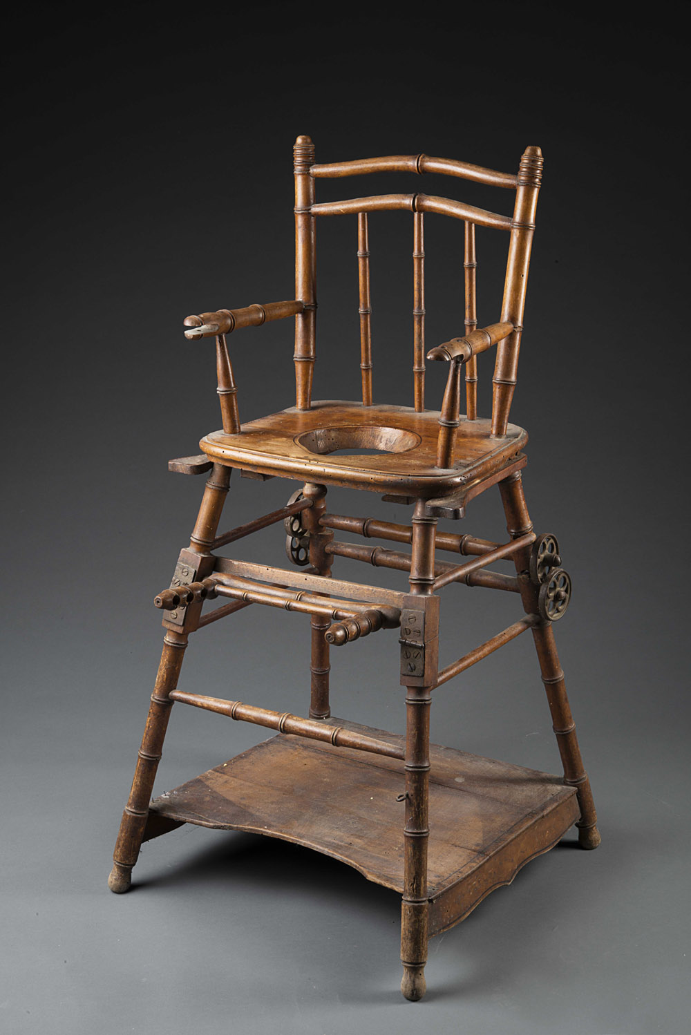 Seggiolone da bambino a comoda in legno tornito con gambe pieghevoli riunite da pianetto trasformabile a tavolino . Munito di rotelle. Sec. XIX (difetti) 19th-century wooden high-chair (defects)