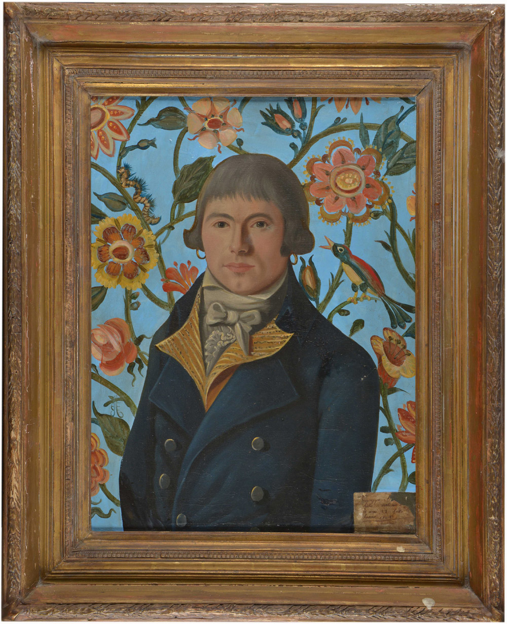 Ignoto "Ritratto maschile con fiori e volatili sullo sfondo" olio su tela (65x50) iscritto in basso a destra. In cornice Unknown artist "Male portrait with flowers and parrots in the background" oil on canvas. Framed