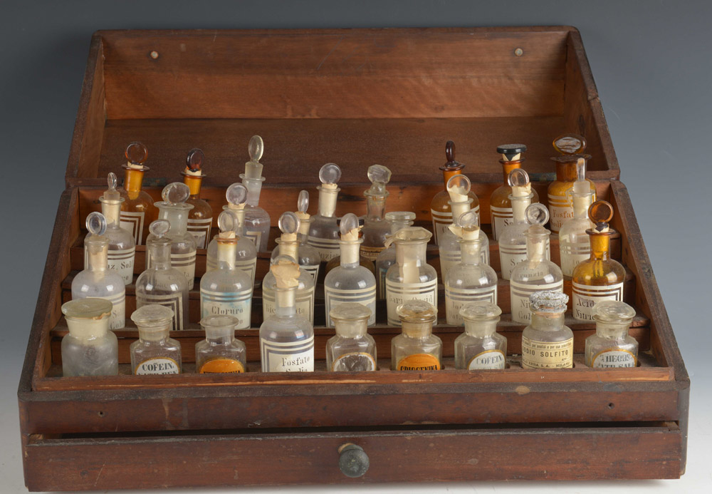 Collezione di numerose bottigliette da farmacia contenute in scatola di...