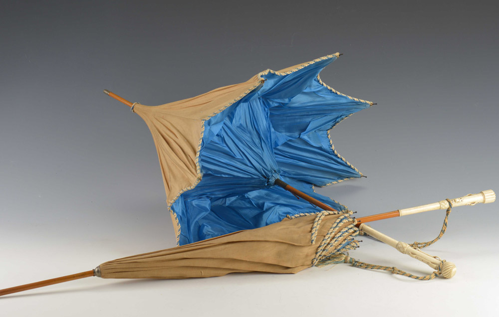 Lotto composto da due ombrelli parasole con manici in avorio inciso e...