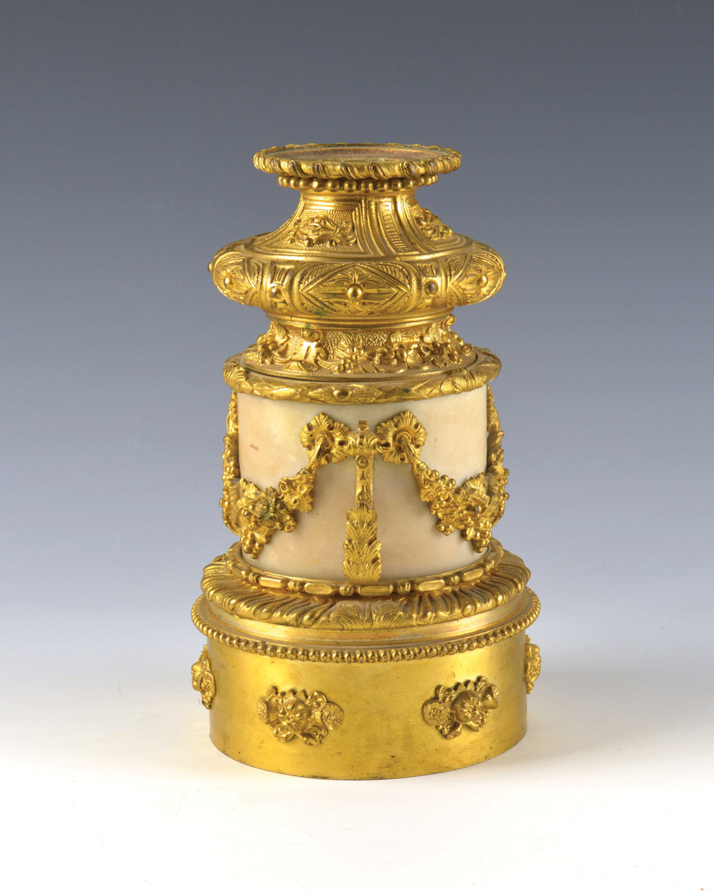 Base a colonna in marmo bianco e bronzo dorato e cesellato a volute fogliate e rosoni che sorreggono trionfi floreali (h cm 25) Sec. XIX 19th-century white marble and gilt-bronze column stand