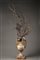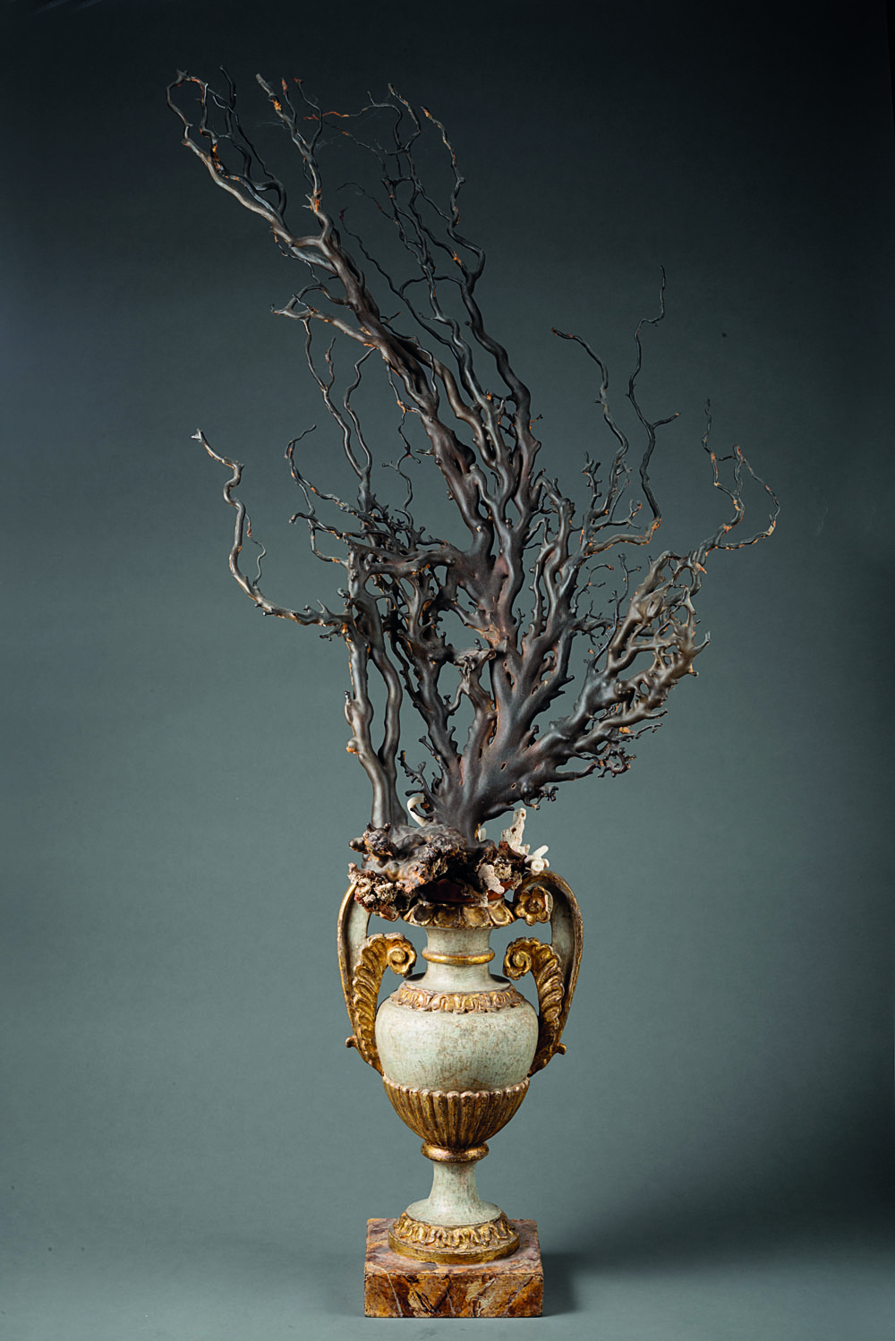 Portapalme biansato del secolo XIX in legno laccato e dorato con base a finto marmo sormontato da un grande ramo di finto corallo nero ( h. cm 127) (lievi difetti) 19th-century wooden "portapalme" surmounted by a large black imitation-coral branch (minor defects)