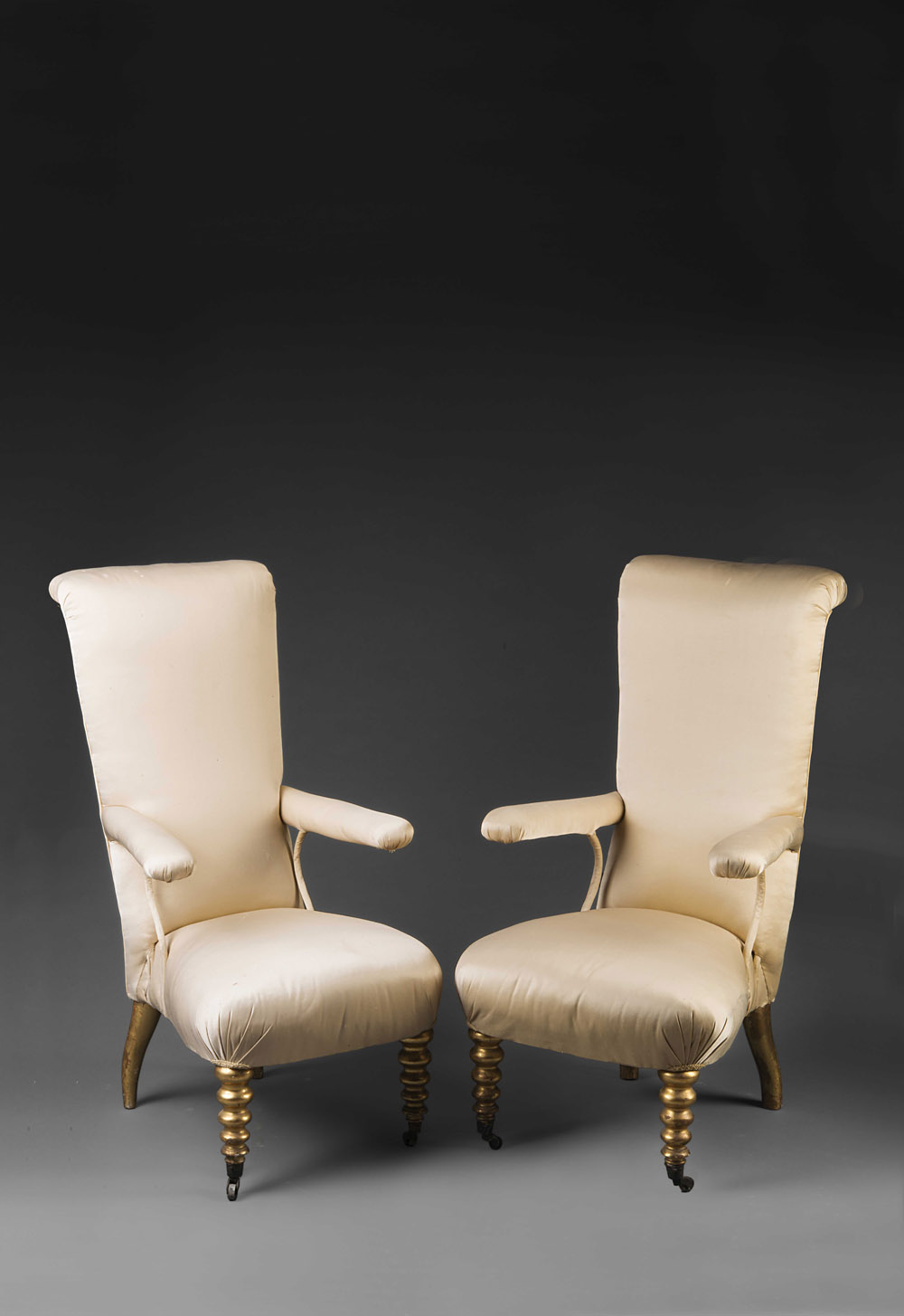 Coppia di poltroncine da camera a schienale alto, gambe anteriori tornite e dorate munite di rotelle. Fine secolo XIX (difetti) Pair of late 19th-century high-back armchairs (defects)