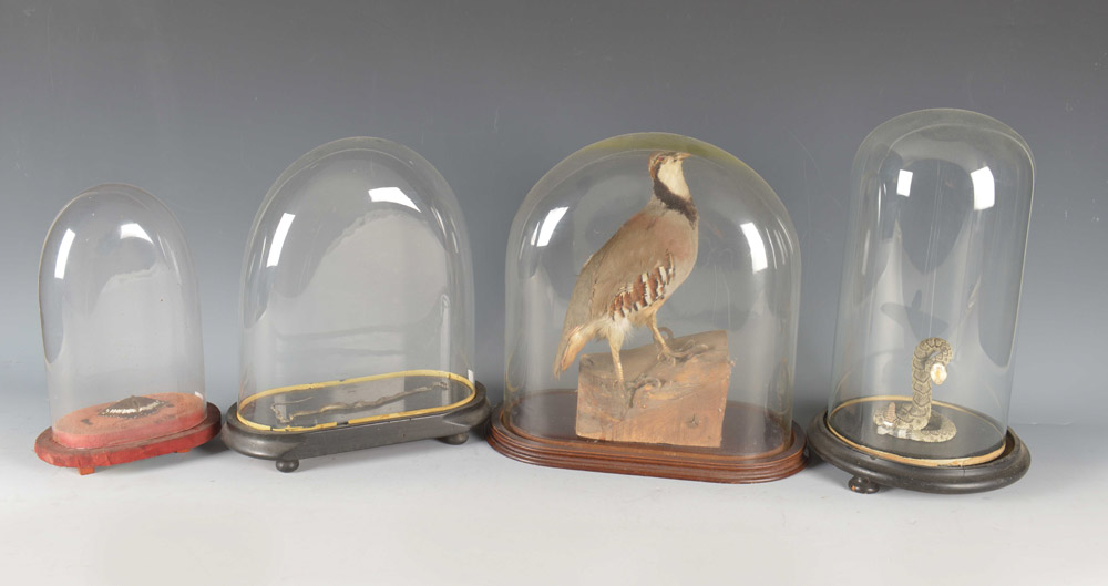 Lotto di quattro teche in vetro con basi in legno contenenti un volatile ed un piccolo serpente imbalsamati, una scultura a forma di cobra ed una farfalla. Secolo XIX (difetti) Lot comprising four 19th-century glass cases with wooden base (defects)