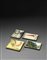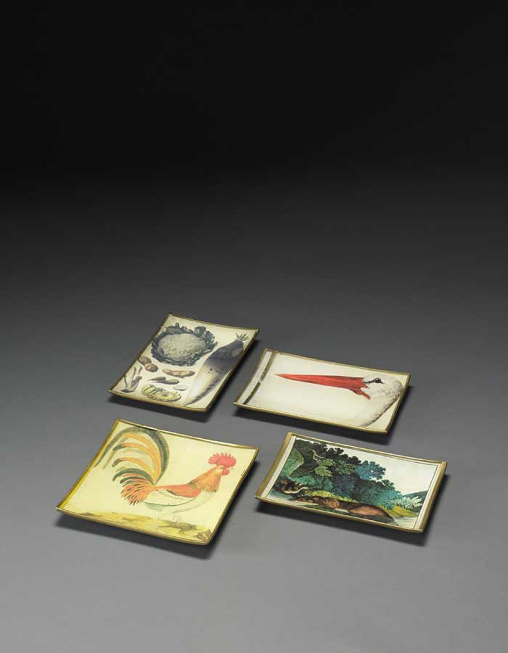 Giulia Maria Michon Pecori gruppo di quattro piatti in vetro decorati a mano con stampe dall'antico raffiguranti soggetti diversi (misure diverse) Group of four hand-decorated glass dishes