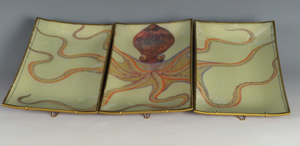 Giulia Maria Michon Pecori gruppo di tre piatti in vetro decorati a mano con stampe dall'antico raffiguranti un polipo (misure totali cm 30x54) Group of three hand-decorated glass dishes