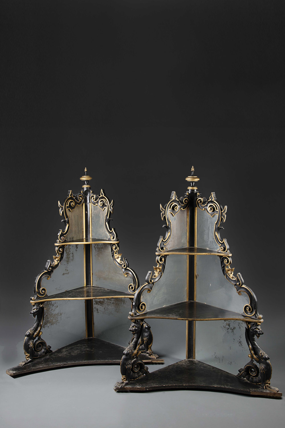 Coppia di alzate angolari a tre ripiani in legno ebanizzato, dorato ed intagliato ad animali fantastici e volute fogliate. Montante terminante a pinnacolo tornito, fondi a specchio. Sec. XIX (cm 106x173x65)(restauri e mancanze) Pair of 19th-century three-shelf corner cabinets (restorations and missing parts)