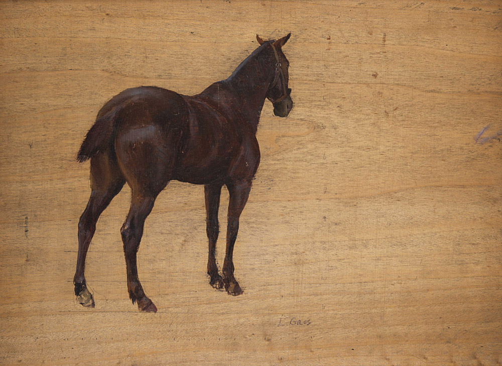 Maestro francese fine secolo XIX 'Cavallo' bozzetto ad olio su tavola (cm 27x36) firmato L.Gros in basso al centro. Prov. Asta Deauville, Agosto 1991, Lotto n.146 Late 19th-century French master "Horse" oil on table sketch