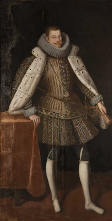 Maestro spagnolo del secolo XVII "Filippo IV di Spagna" olio su tela (cm 205 x 108). In cornice (difetti e restauri) 17th-century Spanish master "Philip IV of Spain" oil on canvas. (defects and restorations)