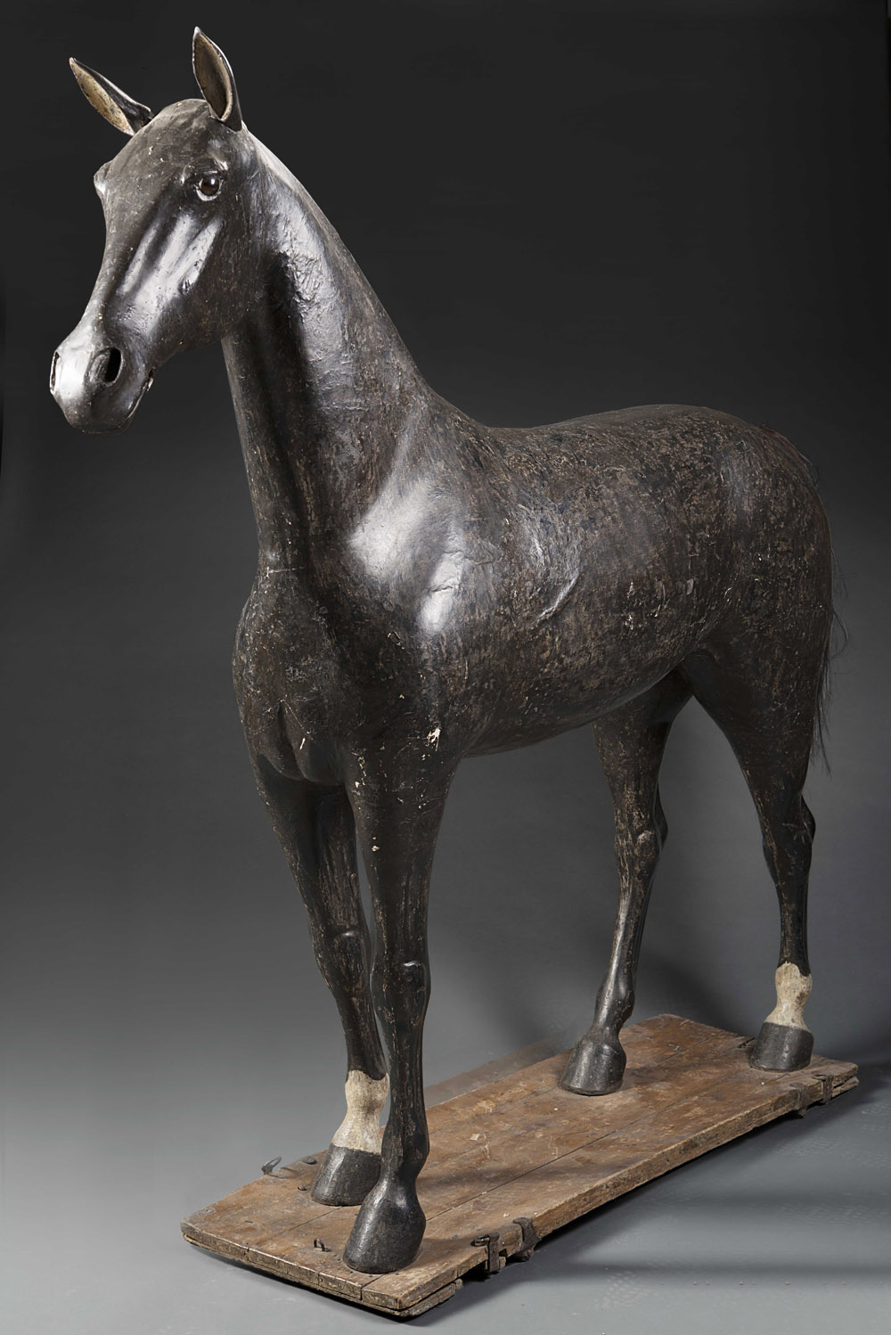 Modello di cavallo cavallo baio scuro a grandezza naturale in legno laccato. Occhi in vetro. Sec. XIX (cm 214x230)(difetti) 19th-century real-size model of wooden bay mare (defects)