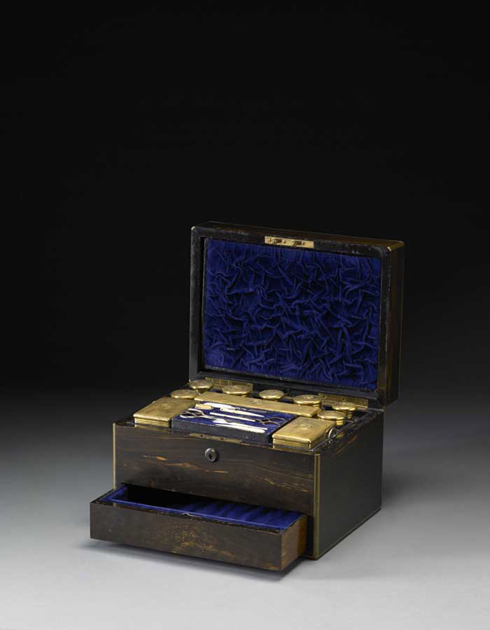 Scatola da toilette in mogano con profili e cifre in ottone ad un cassetto segreto nella fascia. Coperchio apribile celante specchio e un set da manicure in avorio e madreperla. Boccette e scatole in vetro con tappi e ghiere in argento dorato e cifrato. Argentiere Asprey, Londra 1912 (lievi difetti) Mahogany vanity case containing an ivory and mother-of-pearl manicure set (minor defects)