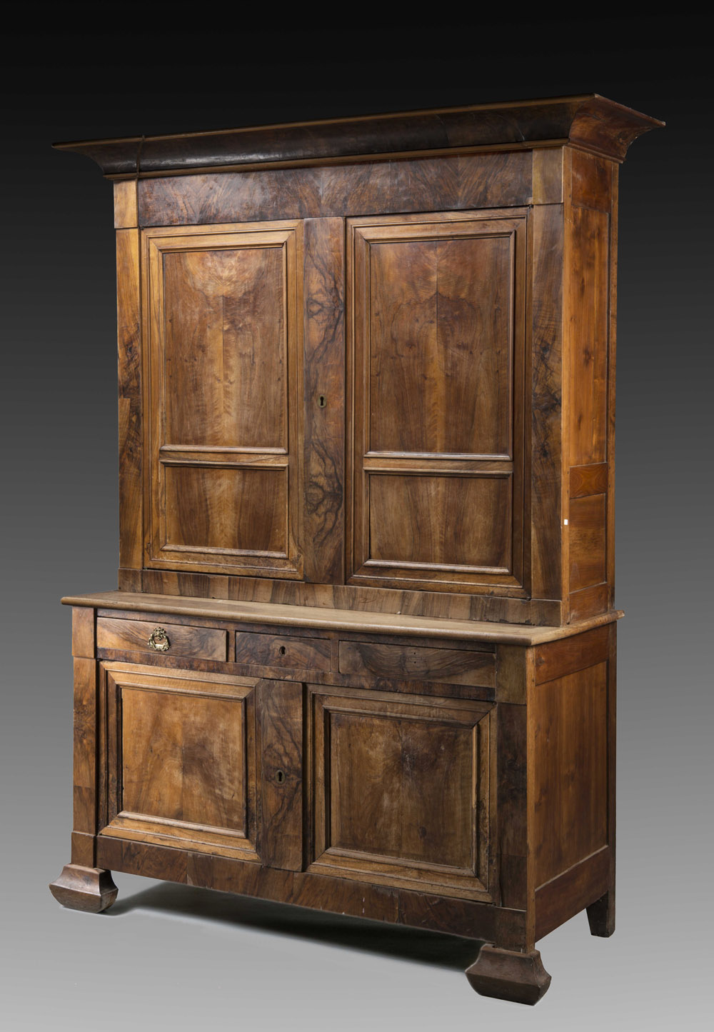 Libreria a due corpi in noce e piuma di noce, parte superiore a due ante riquadrate parte inferiore a tre cassetti e due sportelli. Secolo XIX (180x237x67) (difetti) 19th-century two-element walnut bookcase (defects)