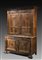 Libreria a due corpi in noce e piuma di noce, parte superiore a due ante...