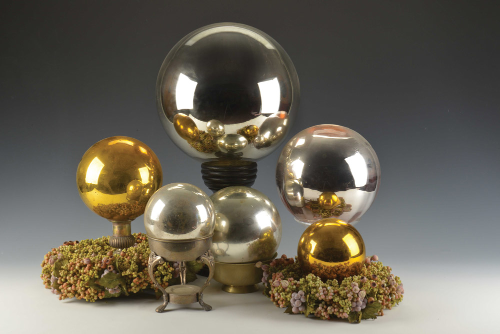 Collezione di sei witchball di diametro diverso poggiate su basi di epoca e materiali differenti Collection of six different witch balls