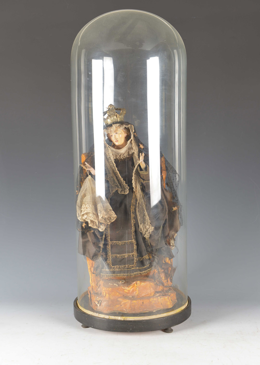 Arte del secolo XIX "Madonna" scultura in legno policromo e cartapesta con abito in seta ricamata e pizzo . Campana di vetro su base in legno ebanizzato dell'epoca (h cm 50) (difetti e mancanze) 19th-century art "Madonna" wood and papier-mâché sculpture (defects and missing parts)