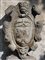 Stemma nobiliare in pietra decorato a volute, testa leonina e Giano bifronte....