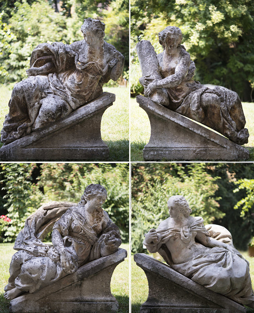 Arte veneta sec.XVIII "Figure femminili" gruppo di quattro sculture in pietra di Vicenza. Poggianti su basi squadrate (cm.120X120X31) 18th-century Venetian art "Female figures" group of four sculptures