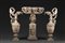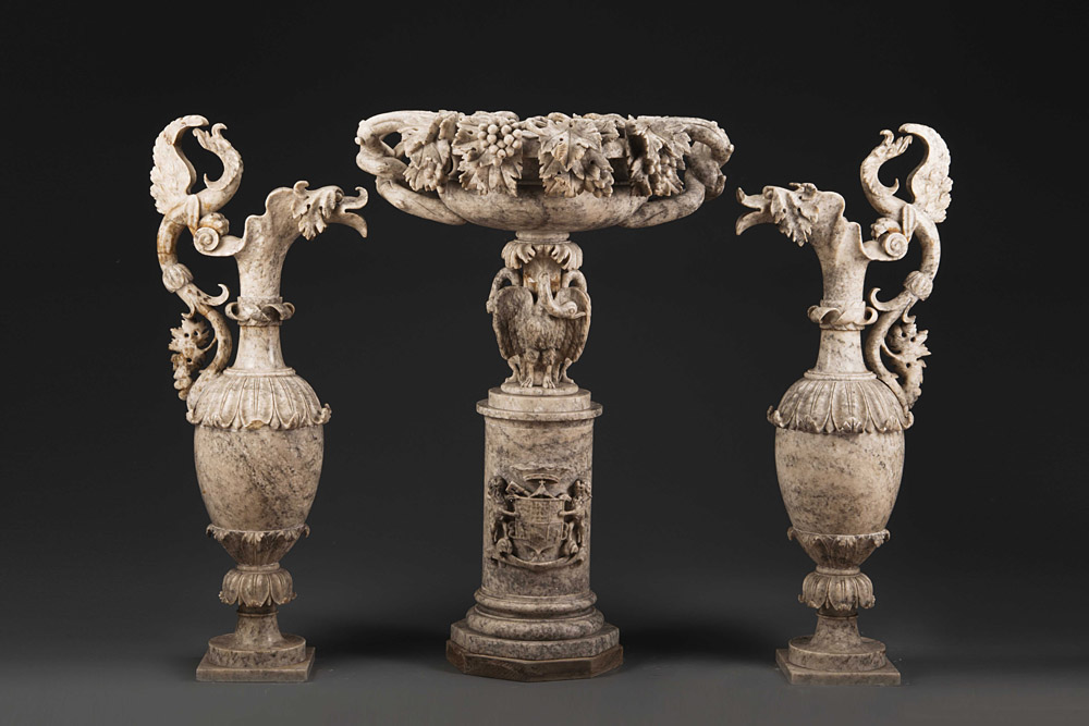 Trittico in onice venato grigio composto da vasca biansata scolpita a tralci di vite con grappoli e sorretta da tre cigni poggianti su base a colonna tornita decorata da stemma nobiliare sorretto da due leoni; due brocche con impugnature scolpite a grifoni, beccuccio ad animale fantastico, corpo decorato a volute fogliate. Sec.XIX (difetti e restauri)(h.cm.94) 19th-century grey-veneered onyx triptyque (defects and restorations)