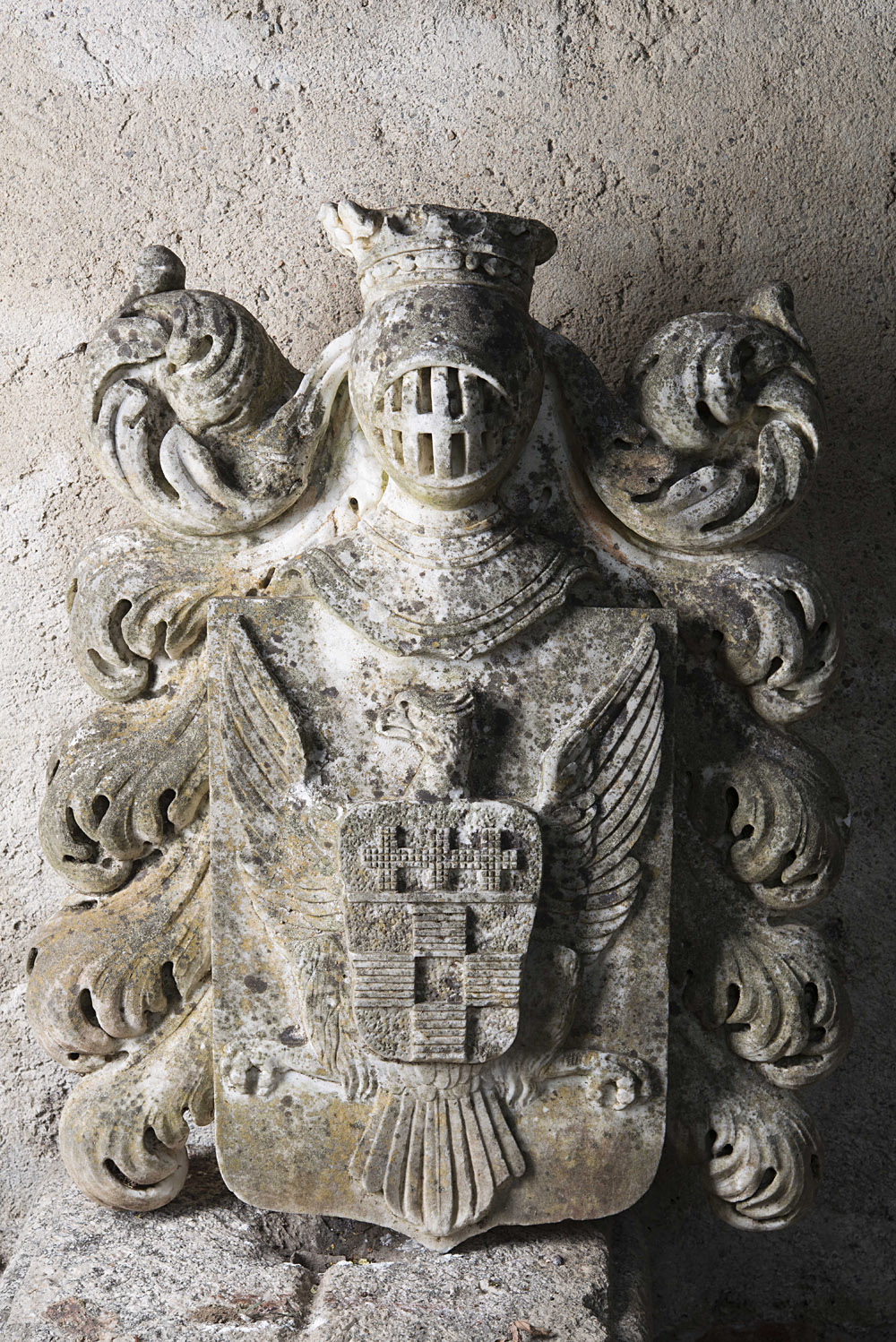Stemma nobiliare in marmo bianco scolpito con aquila sormontata da elmo con...