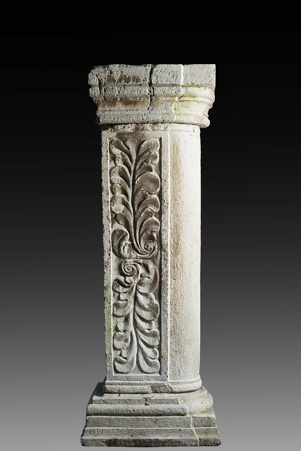 Base architettonica in marmo di forma lobata con facce scolpite a volute fogliate ed animali fantastici. Sec.XVII (h.cm.137x50)(difetti) 17th-century architectural marble base (defects)