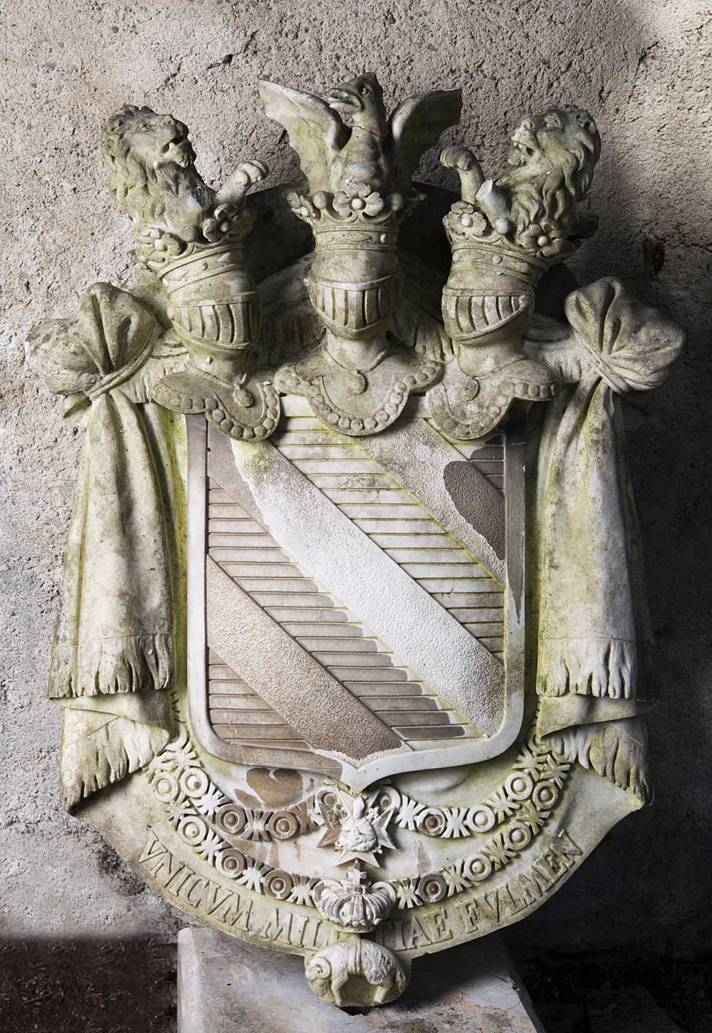 Stemma della Famiglia Sangro scolpito nella parte superiore a scudo sormontato da tre elmi con cimieri animati, nella parte inferiore scritta e Toson d'oro. Napoli sec.XIX (cm.70X50) 19th-century coat of arms of the Sangro family from Naples