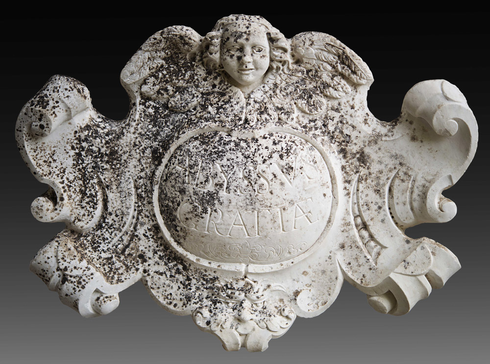 Grande fregio in marmo di forma mossa iscritto "Abyssus gratiae" e sormontato...