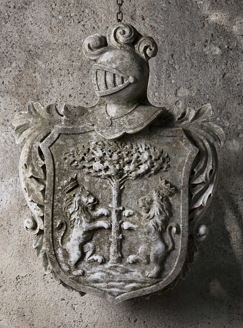 Stemma nobiliare in marmo bianco scolpito a volute e leoni rampanti attorno ad un albero. Sormontato da elmo piumato. Sec.XIX (cm.60X45) 19th-century white marble coat of arms