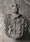 Stemma nobiliare in marmo bianco scolpito a volute e leoni rampanti attorno...