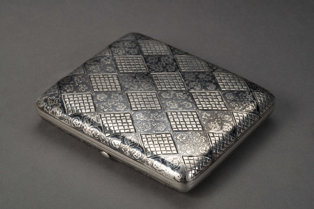 Scatola portasigarette in argento niellato cesellata a losanghe (difetti)...