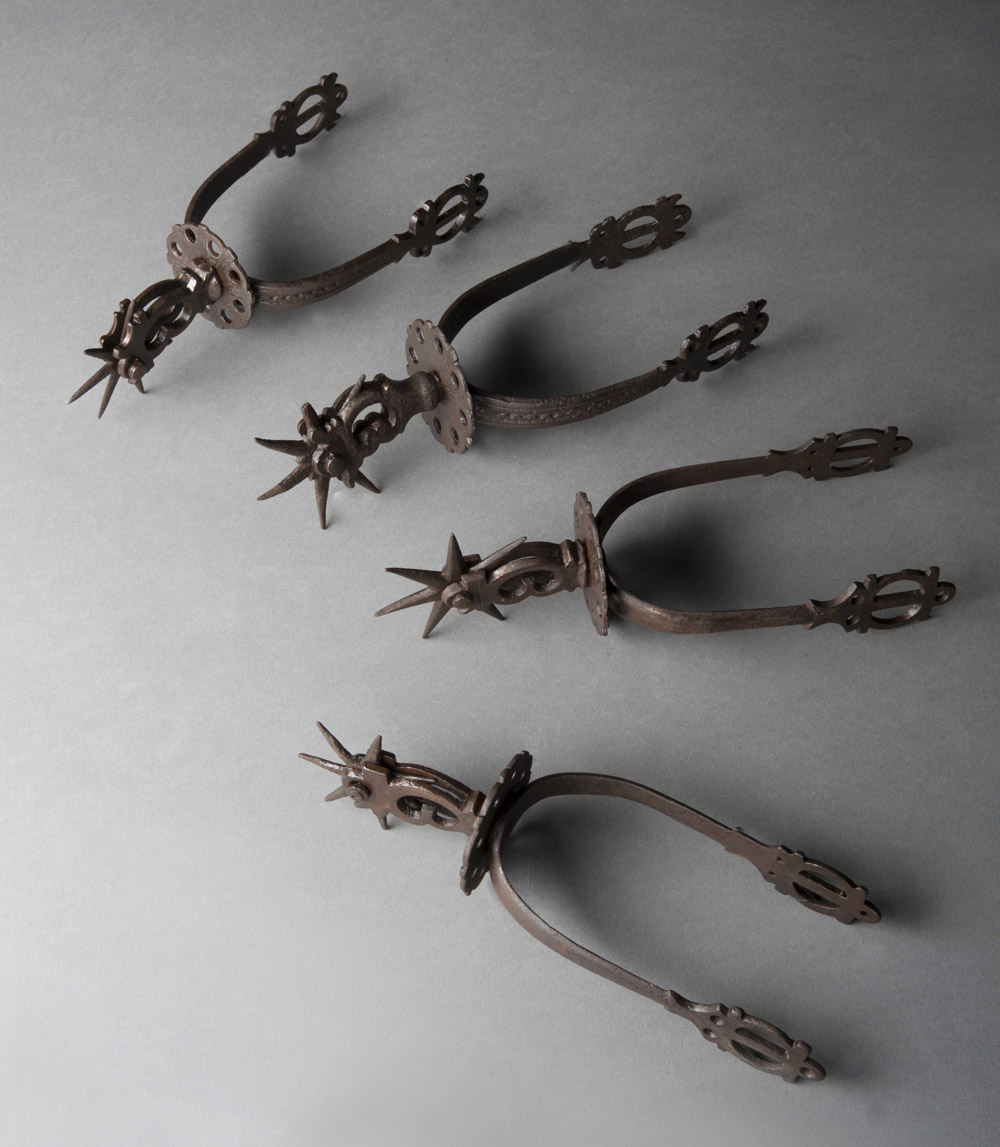 Coppia di speroni in ferro battuto uniti a due diversi decorati a motivi stilizzati. Secolo XVIII(difetti) Pair of 18th-century wrought iron studs plus two different ones (defects)
