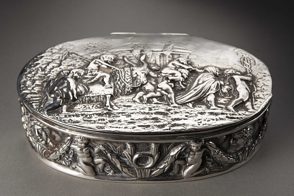Scatola di forma ovale in argento con corpo sbalzato a figure classiche (gr...