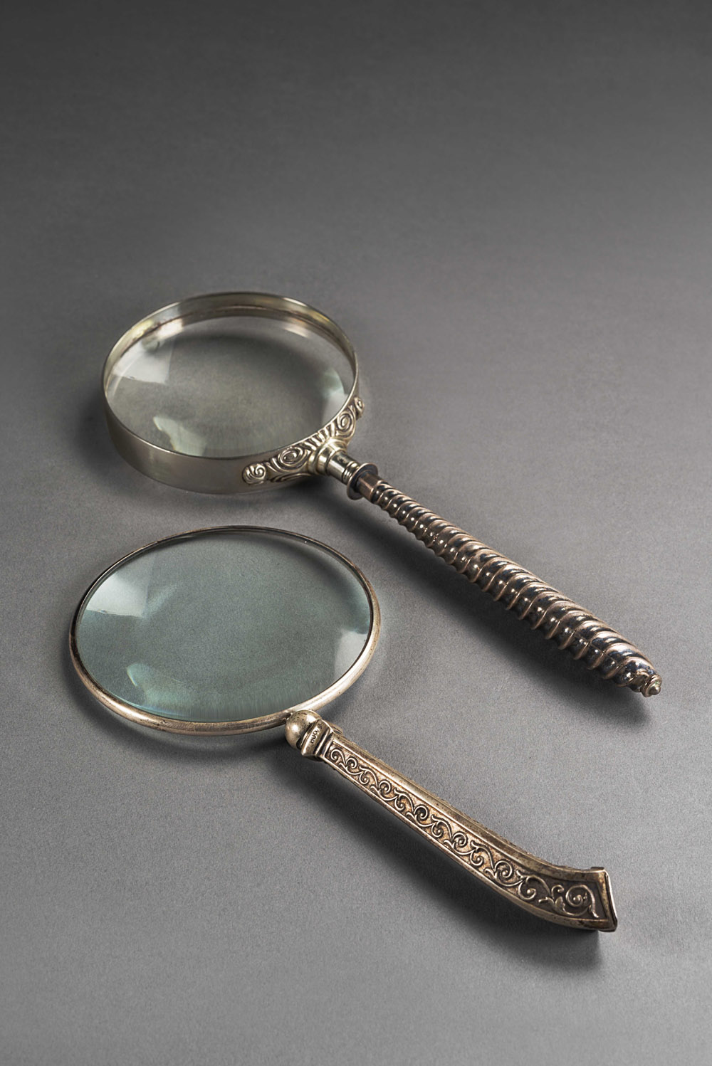 Lotto di due lenti di ingrandimento con manici in argento cesellato Lot comprising two magnifying glasses