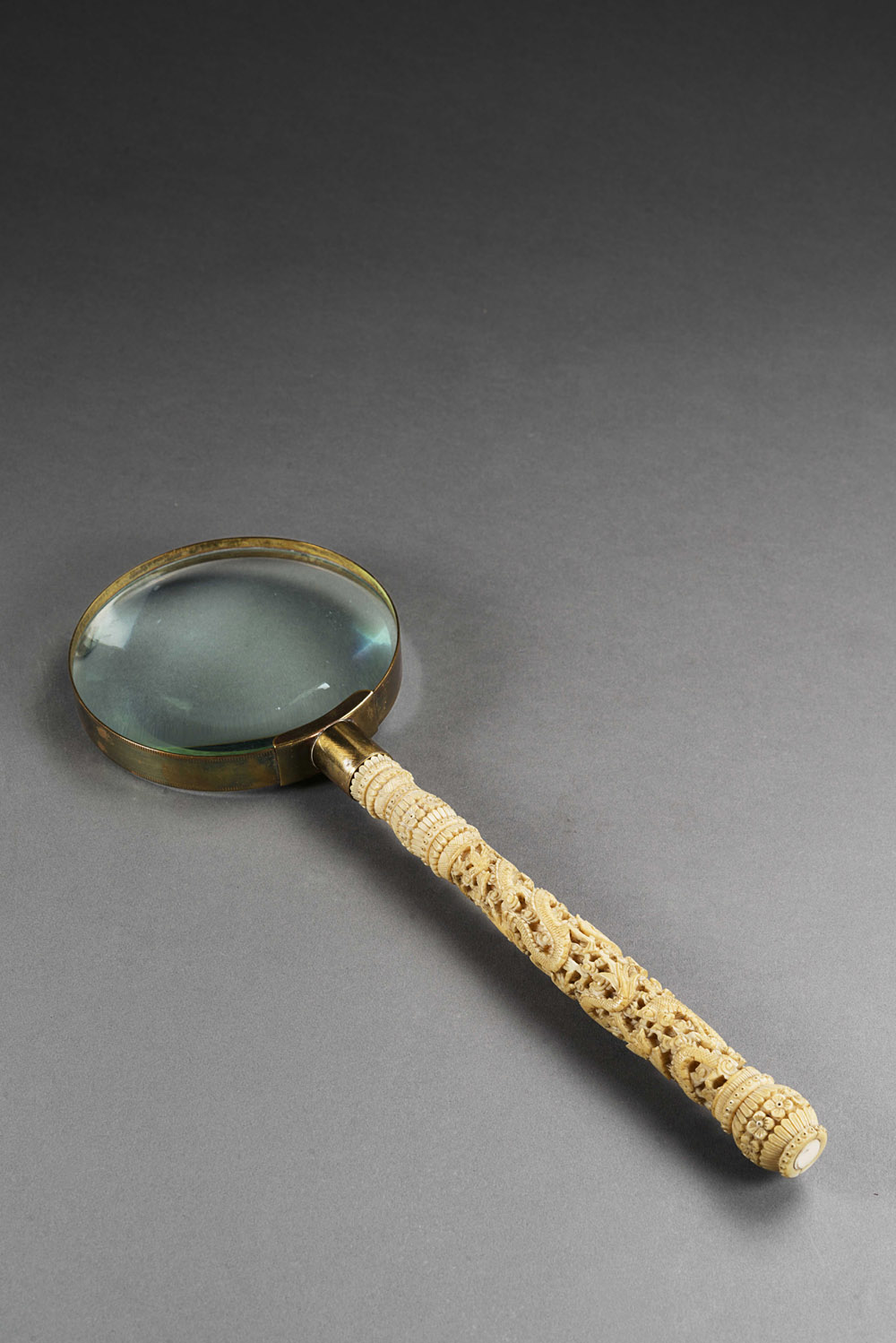 Arte di Cina del XIX secolo per il mercato europeo. Lente di ingrandimento con manico in avorio scolpito con uccelli e draghi; placca con iniziali (l cm 30) 19th-century Chinese art for the European market. Magnifying glass