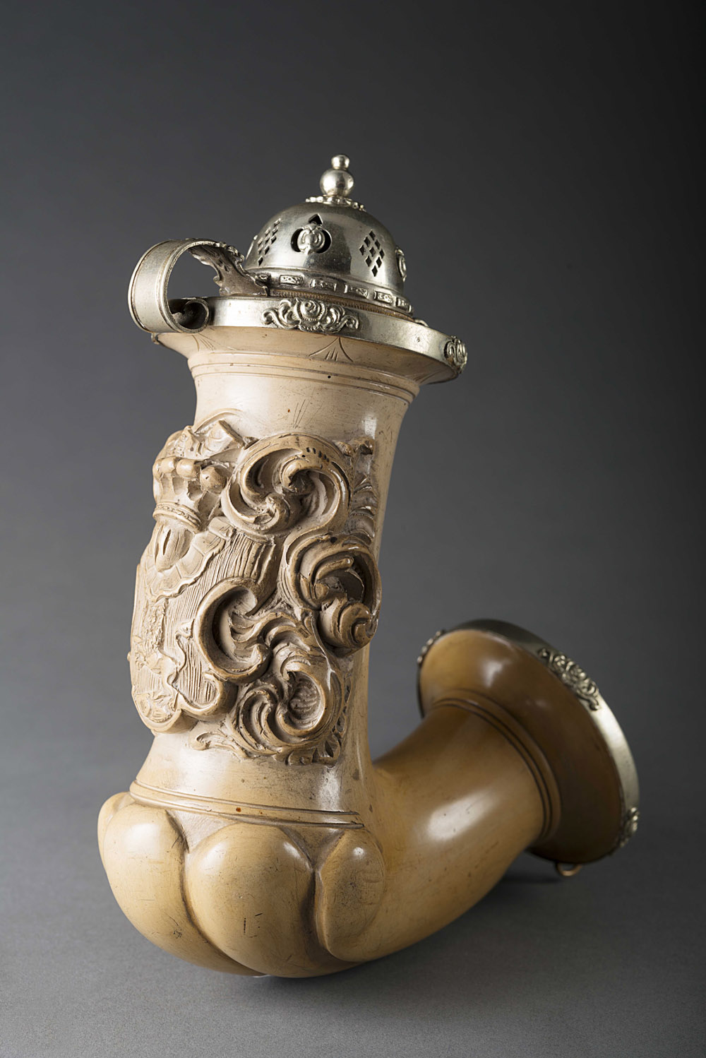Pipa in schiuma con ghiera in metallo argentato e corpo decorato in rilevo con stemma araldico coronato. Sec.XIX (cm.14) 19th-century meerschaum pipe with silver-plated metal rim